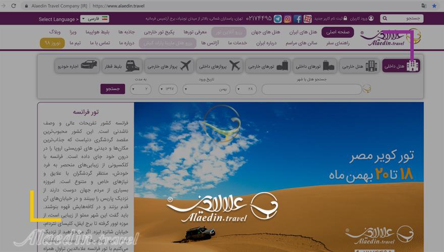 وبسایت علاءالدین تراول دنیایی از اطلاعات است. هر اطلاعاتی که از گردشگری نیاز داشته باشید، میتوانید در سریعترین زمان ممکن در این وبسایت بیابید. اطلاعاتی از قبیل همه دیدنیهای گردشگری ایران و جهان در صفحه جاذبههای گردشگری، انواع ویزاها در صفحه ویزاها، تاریخ حرکت تورهای ایرانگردی درصفحه رزرو آنلاین تور داخلی، تاریخ برگزاری تورهای جهانگردی در صفحه پکیج تورهای خارجی، راهنمای سفر یا تراول گاید در صفحه راهنمای سفر به شهرهای جهان، تشریفات و سالنهای برگزاری مراسم در صفحه سالنهای مراسم و ... به راحتی در سایت علاءالدین تراول قابل دسترسی است. همچنین میتوانید در این وبسایت درباره ایران بیشتر بدانید و از اخبار گردشگری ایران و جهان آگاه شوید و هر روز از مطالب وبلاگ ما لذت ببرید، در جریان خدمات کامل ما باشید، با افراد تیم ما آشنا شوید، هتلهای ایران را کاووش نمائید و در کل هر آنچه که از یک وبسایت گردشگری انتظار دارید را در آن بیابید.