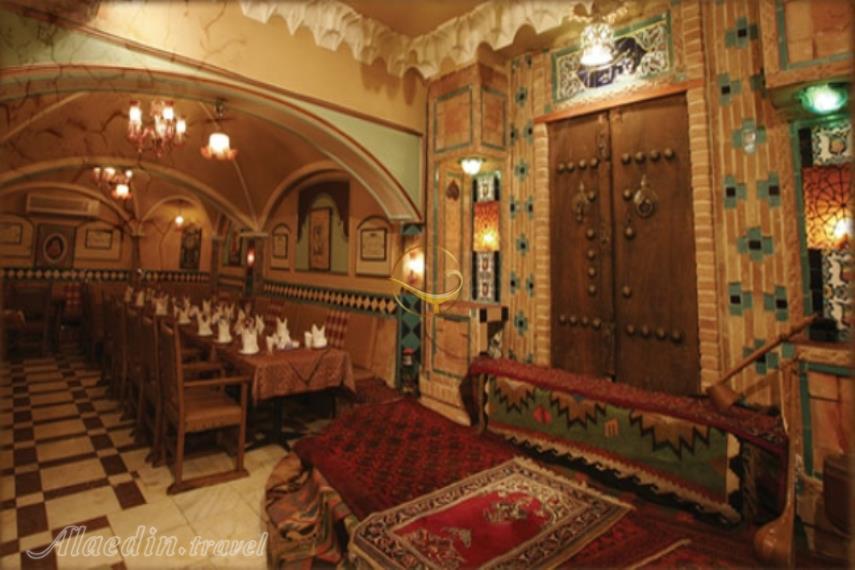 از درب ورودی تا سراسر سالن رستوران، به سبک سنتی دیزاین شده است. وسیلههایی که در چیدمان سالن استفادهشده است همگی از فرهنگ اصیل ایرانی نشات میگیرند. روی دیوارها تماما با طرحهای ایرانی نقاشی شدهاند و طاقهای سنتی با گچبریهای زیبا و کاشیهای فیروزهای روح معماری کهن ایران را بر فضا دمیده است. وقتی وارد سالن میشوید اولین چیزی که نظرتان را به خود جلب میکند سماور بزرگ قدیمی با قوری و قلیان است. چلچراغهای قدیمی باشکوه با گچبریهای زیبای روی سقف، کاخهای قدیمی اشرافی را به یادتان میآورد. در این رستوران بهجای صندلی از تخت برای نشستن استفادهشده است و در اصل کاناپههای چوبی هستند که بین دو کاناپه میز غذا قرار دارد. روی تمام میزها، رومیزیهای صنعتی اصفهان را میبینید که سرویس غذا رویشان چیده شده است. البته دورتادور دیوار سکوهای مفرش با پشتی میبینید و جلو سکوها نیز میز غذا قرار دارد. در میان سالن غذا، سلفسرویس قرار دارد که شما میتوانید بشقابهای غذا و قاشق و چنگالتان را بردارید و از سالادها، میوهها و سایر مخلفات استفاده کنید.